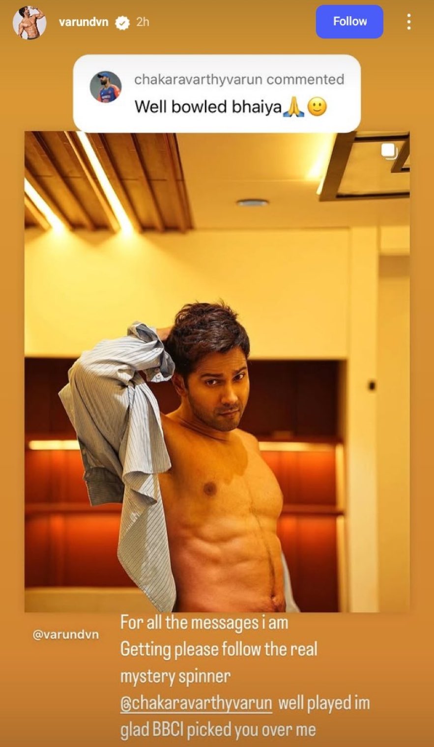 While praising Chakravarthy, several Instagram users mistakenly applauded Varun Dhawan and the actor had to clarify the situation. Dhawan highlighted Varun Chakravarthy’s original account and hilariously wrote that he is glad BCCI picked the correct Varun in the team.