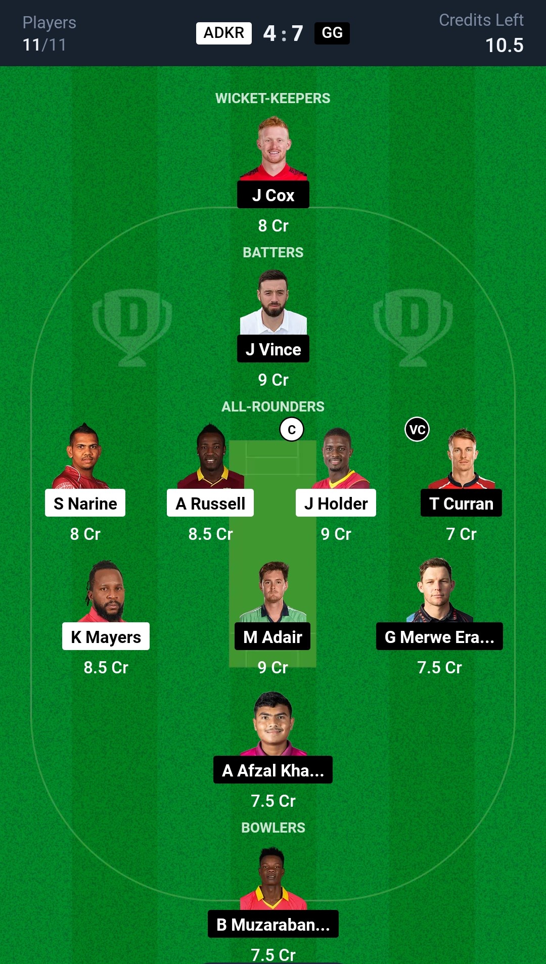 Abu Dhabi Knight Riders: Kyle Mayers, Andries Gous, Joe Clarke (wk), Roston Chase, Alishan Sharafu, Andre Russell, Jason Holder, Sunil Narine (c), David Willey, Ibrar Ahmad, Terrance Hinds, Ali Khan