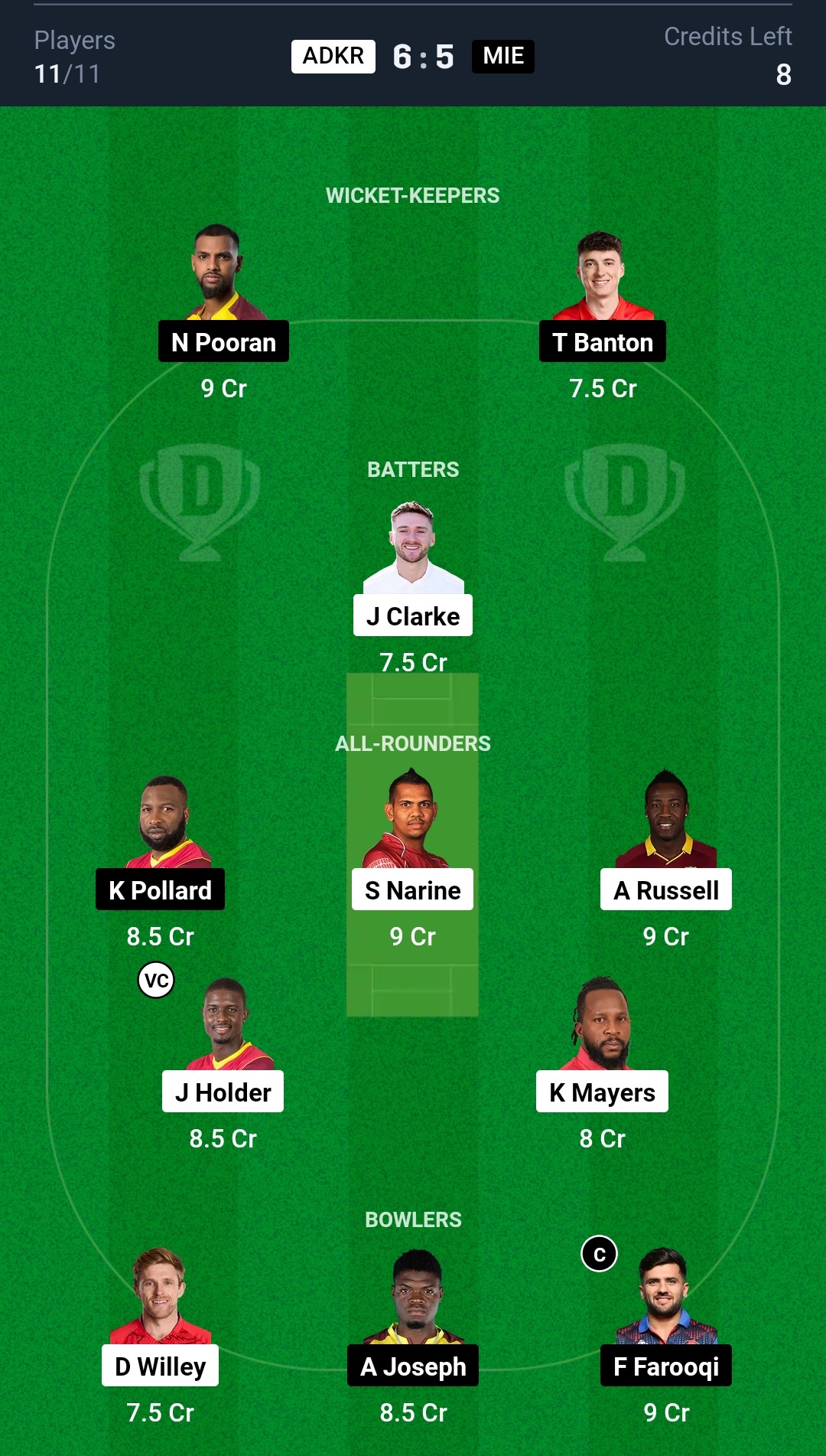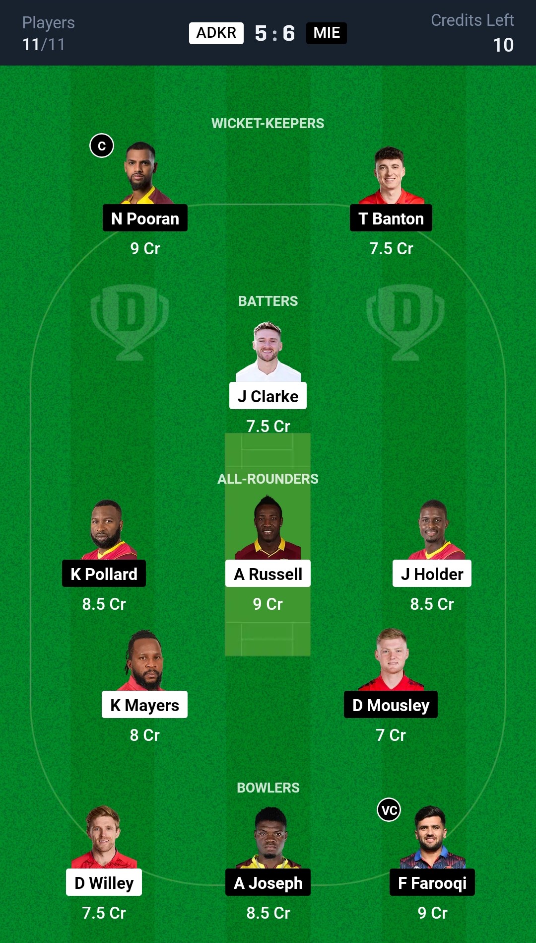 Grand League Team for ADKR vs MIE Dream11 Prediction