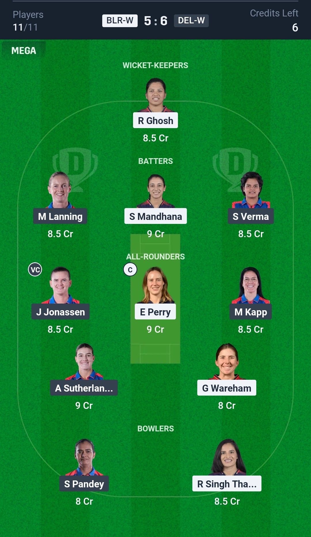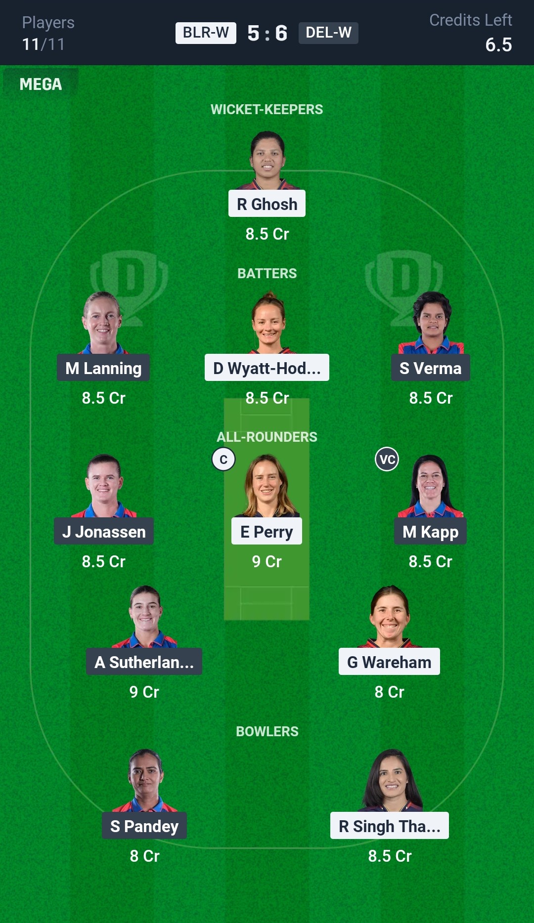 Grand League Team for BLR-W vs DEL-W Dream11 Prediction