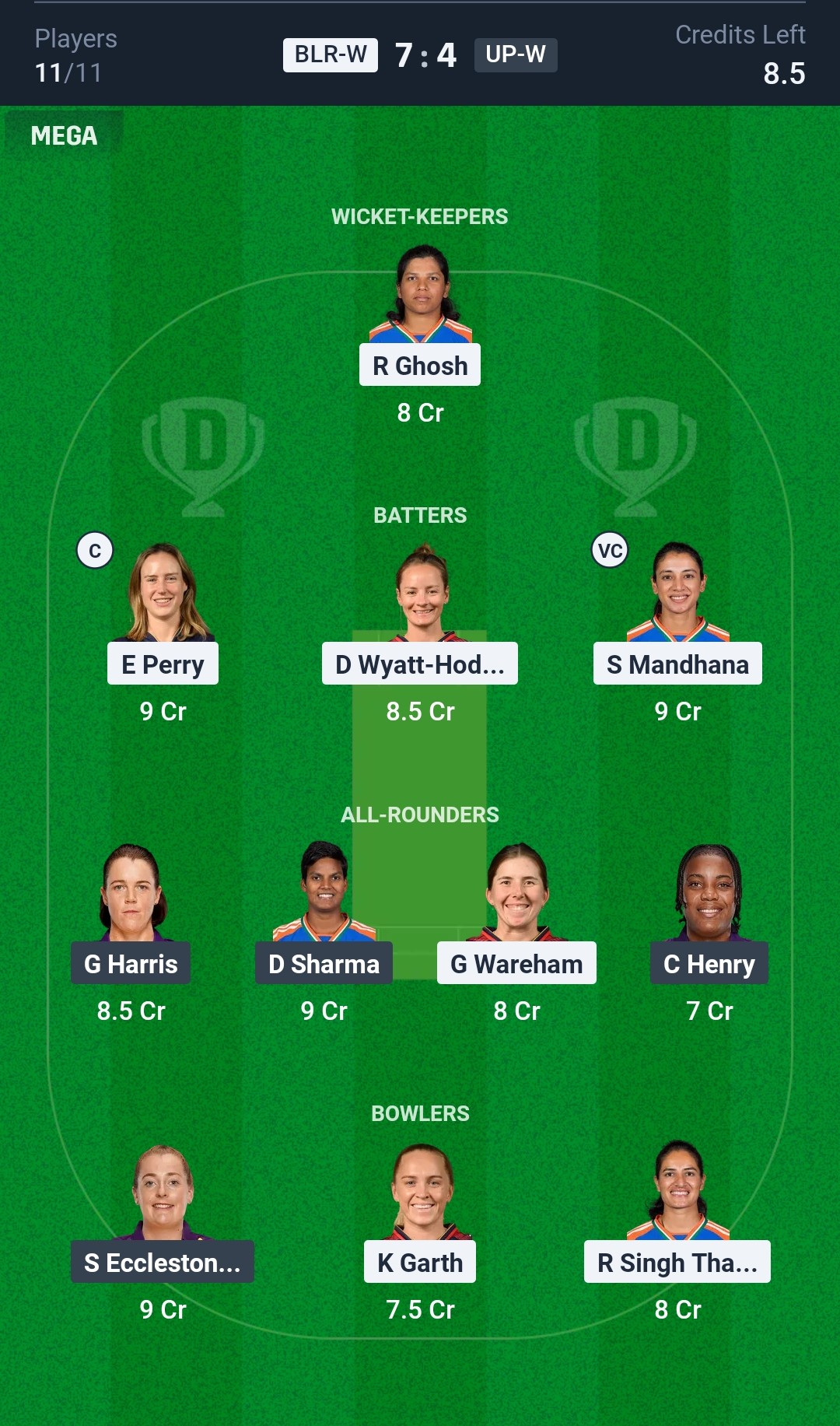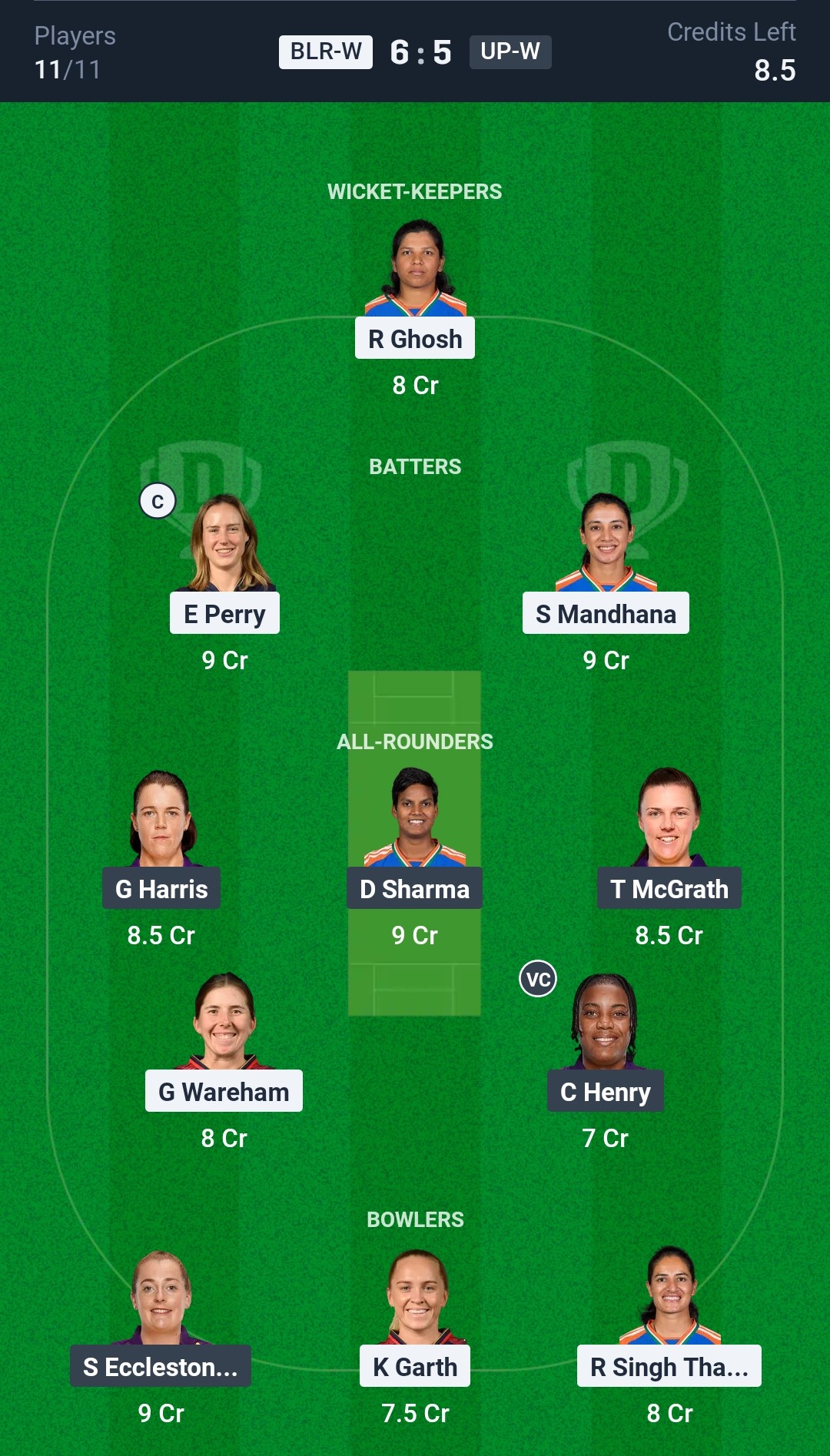 RCB Women have a stronger batting unit with Smriti Mandhana, Ellyse Perry, and Richa Ghosh in good touch. UP Warriorz, on the other hand, have struggled badly with Henry being the only positive. Expect RCB Women to win this match.