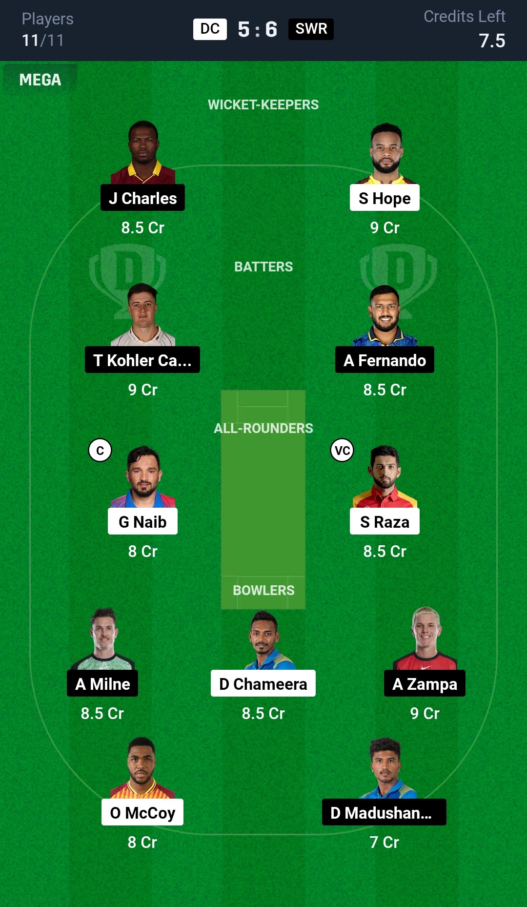 Dubai Capitals: Shai Hope (wk), Ben Dunk, Khalid Shah, Gulbadin Naib, Sikandar Raza (c), Najibullah Zadran, Rovman Powell, Dasun Shanaka, Haider Ali, Obed McCoy, Dushmantha Chameera, Zahir Khan