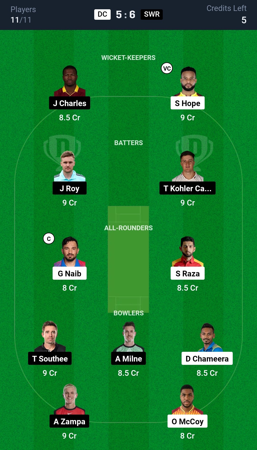 Sharjah Warriorz: Tom Kohler-Cadmore (wk), Johnson Charles, Avishka Fernando, Rohan Mustafa, Jason Roy, Tim Seifert, Ashton Agar, Ethan D’Souza, Adam Milne, Tim Southee (c), Dilshan Madushanka, Adam Zampa