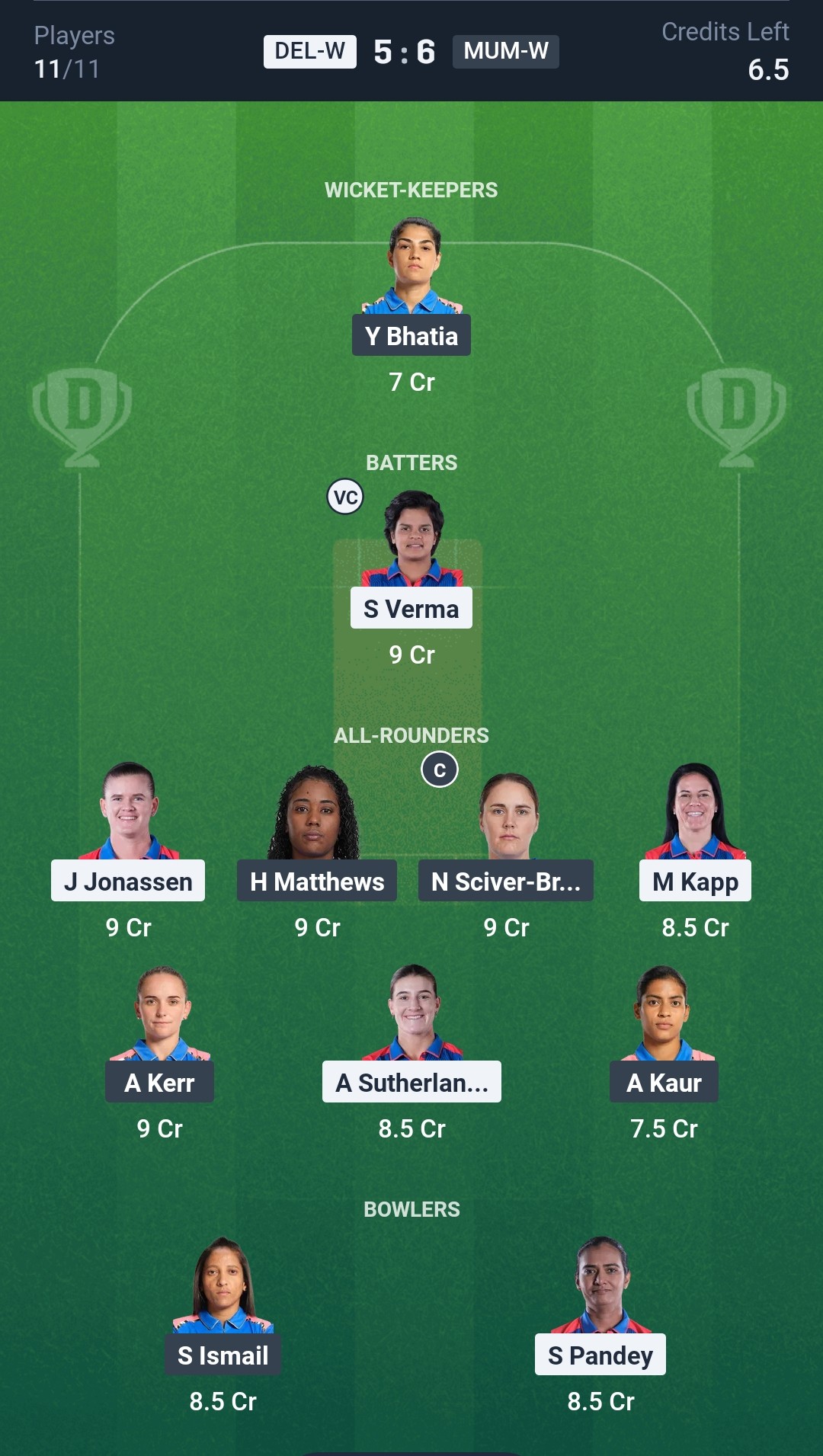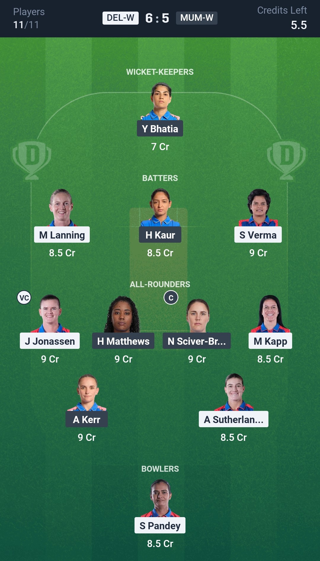 Mumbai Indians Women: Hayley Matthews, Yastika Bhatia (wk), Nat Sciver-Brunt, Harmanpreet Kaur (c), Amelia Kerr, Sajeevan Sajana, Amanjot Kaur, G Kamalini, Sanskriti Gupta, Shabnim Ismail, Saika Ishaque.