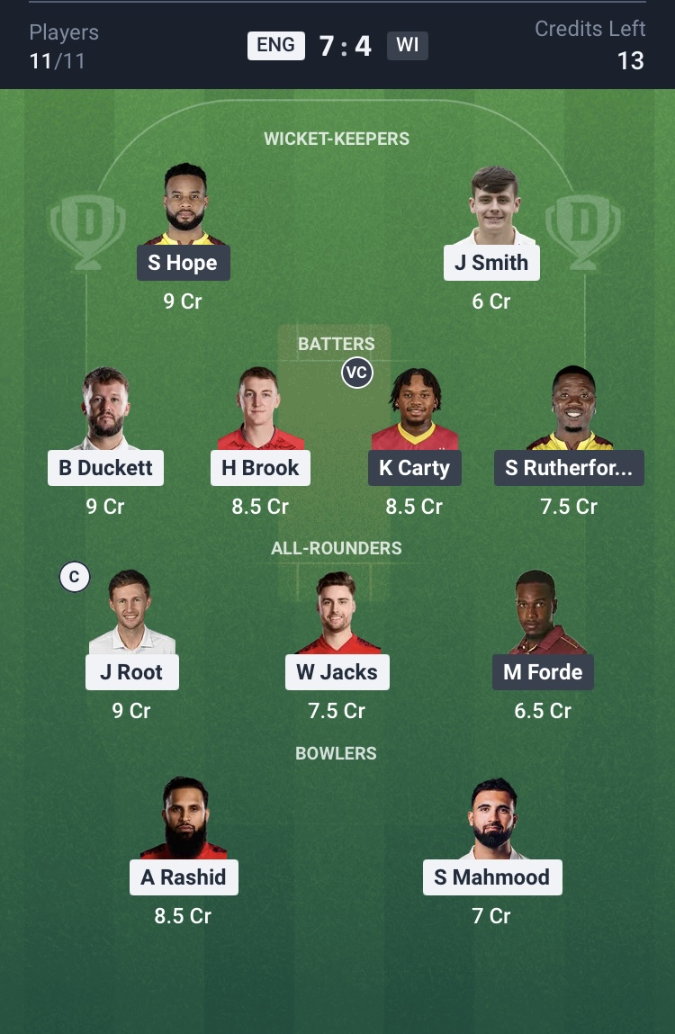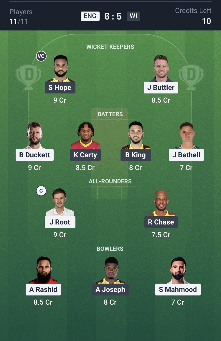 Small League Team for ENG vs WI Dream11 Prediction