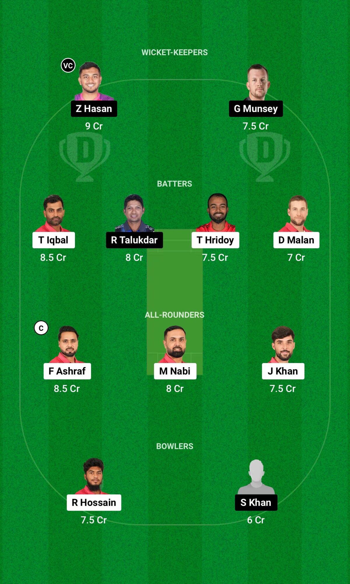 Fortune Barishal: Tamim Iqbal (c), Towid Hridoy, Dawid Malan, Mushfiqur Rahim (wk), Mahmudullah, Mohammad Nabi, Faheem Ashraf, Rishad Hossain, Jahandad Khan, Tanvir Islam, Ripon Mondol