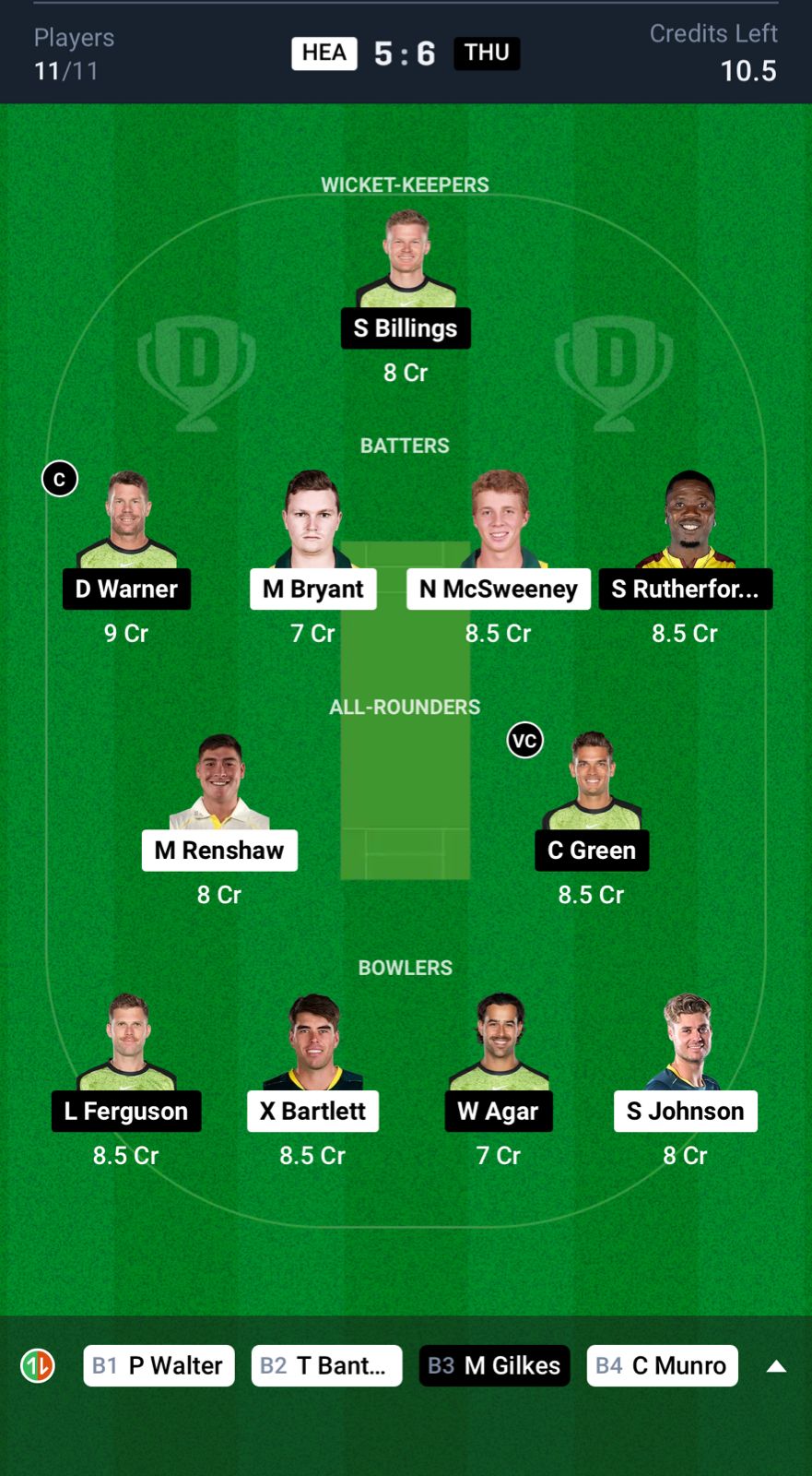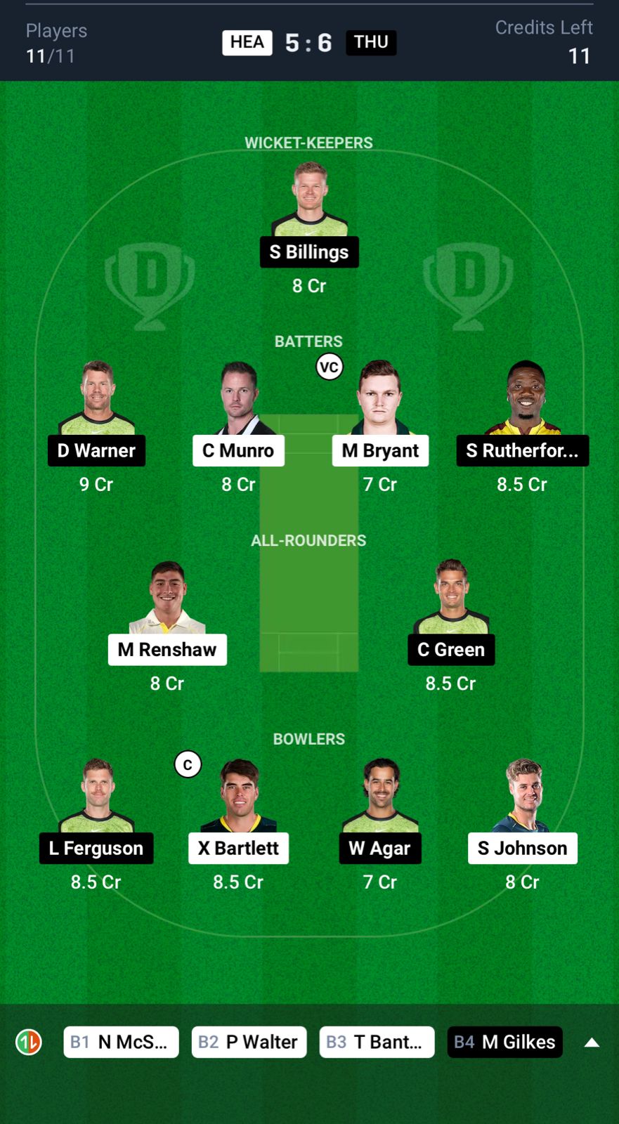 Sydney Thunder: David Warner (c), Matthew Gilkes, Blake Nikitaras, Oliver Davies Sam Billings (wk), Sherfane Rutherford, Chris Green, Hugh Weibgen, Tom Andrews, Lockie Ferguson, Wes Agar