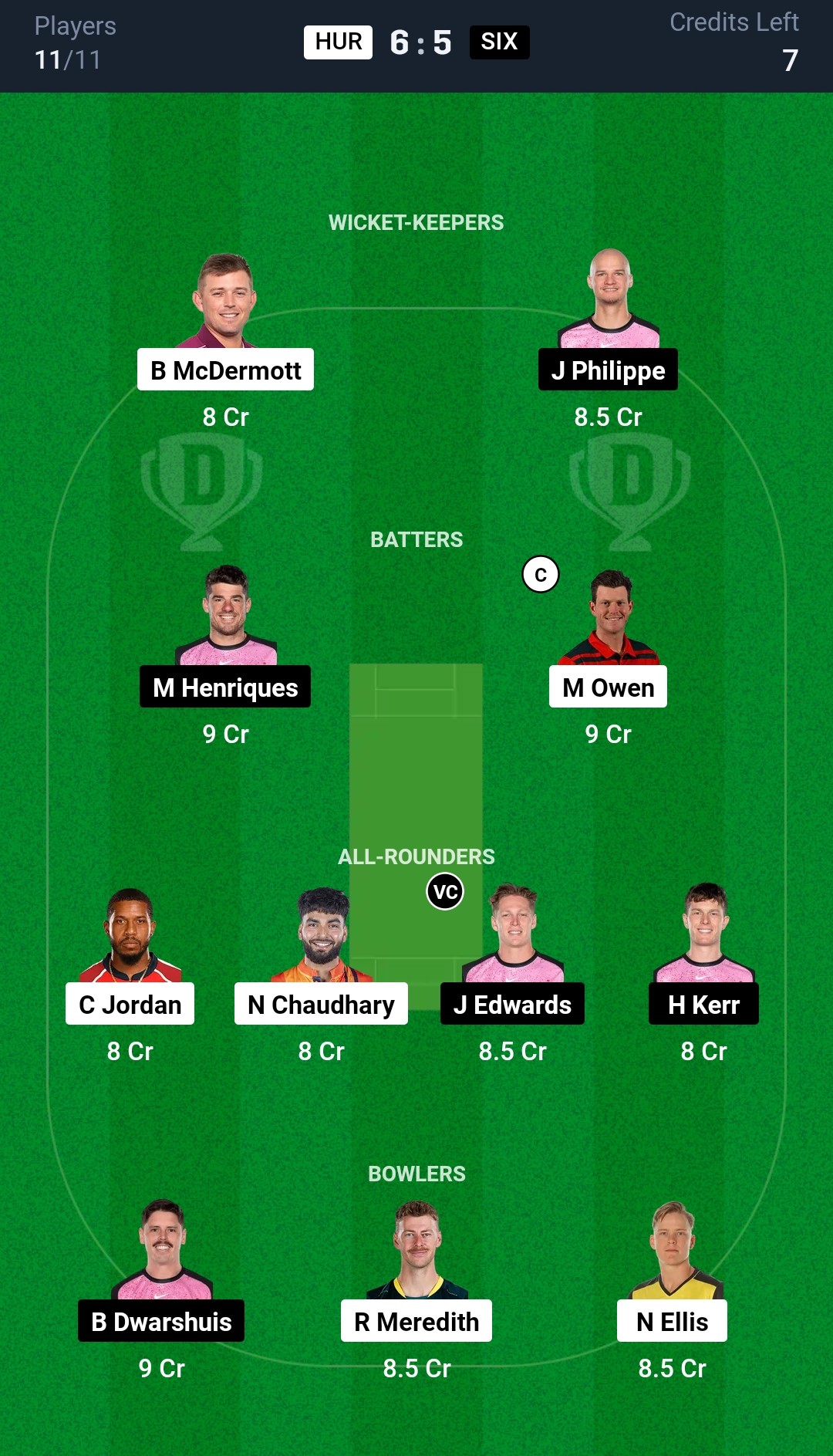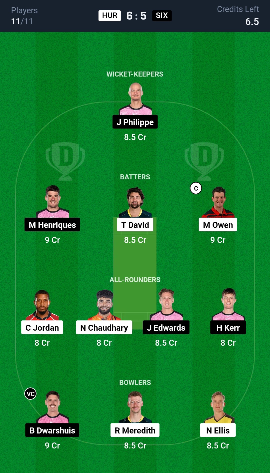 Hobart Hurricanes: Mitchell Owen, Caleb Jewell, Charlie Wakim, Nikhil Chaudhary, Ben McDermott, Matthew Wade (wk), Tim David, Chris Jordan, Nathan Ellis (c), Peter Hatzoglou, Riley Meredith
