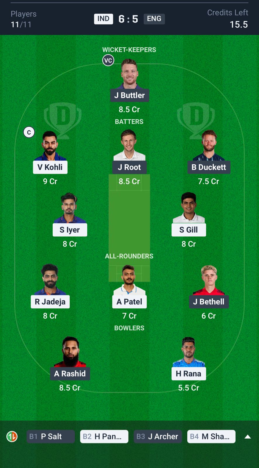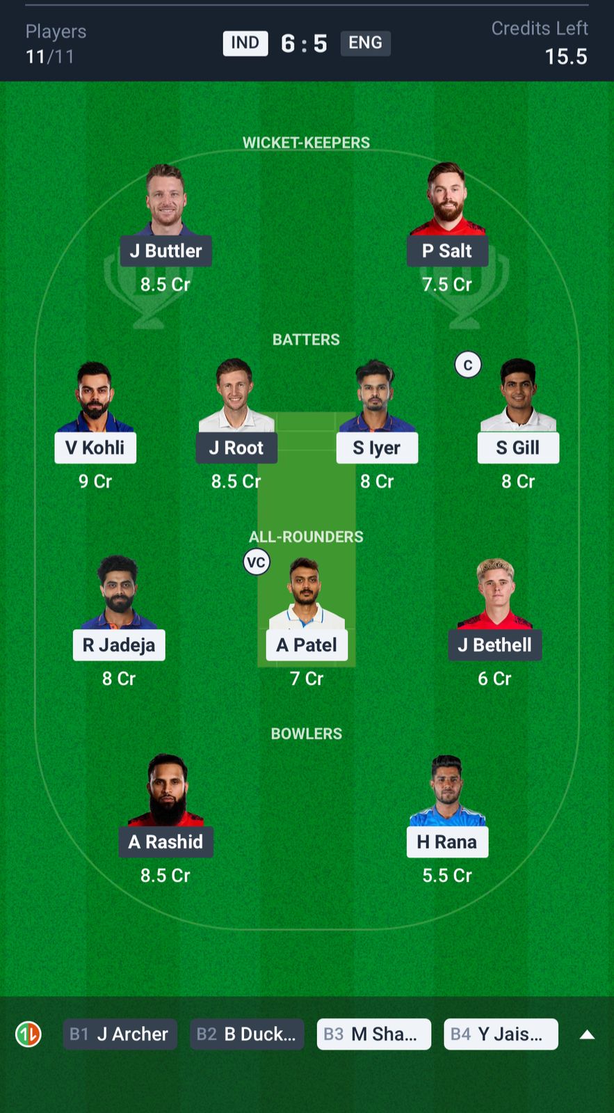 England: Ben Duckett, Philip Salt (wk), Joe Root, Harry Brook, Jos Buttler (c), Liam Livingstone, Jacob Bethell, Brydon Carse, Jofra Archer, Adil Rashid, Saqib Mahmood.