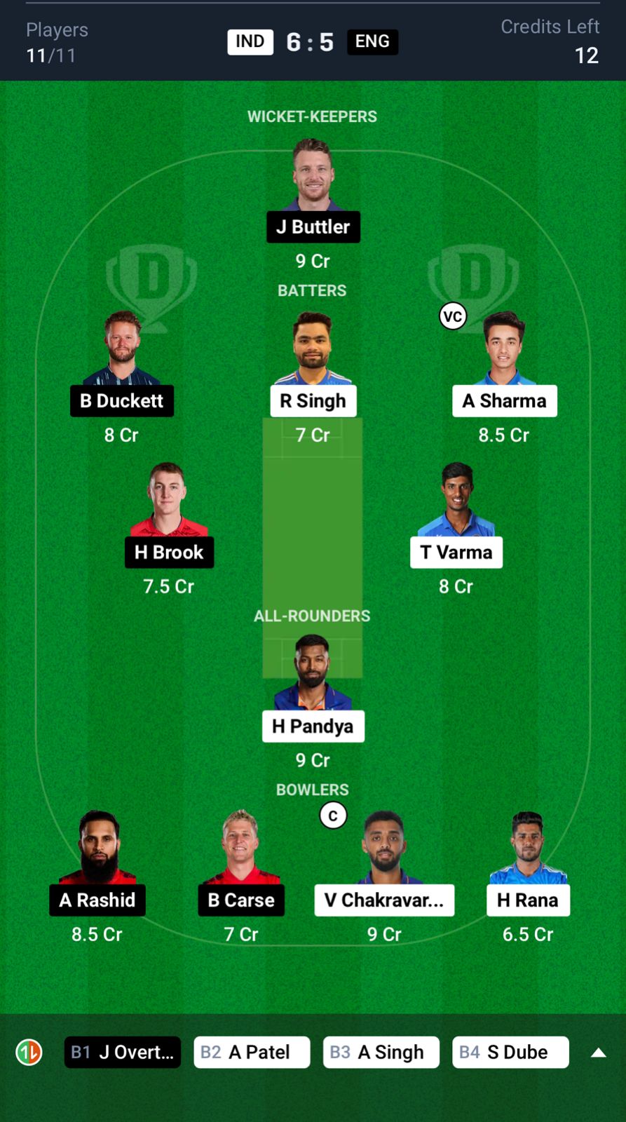 England: Philip Salt (wk), Ben Duckett, Jos Buttler (c), Harry Brook, Liam Livingstone, Jacob Bethell, Jamie Overton, Brydon Carse, Jofra Archer, Adil Rashid, Saqib Mahmood