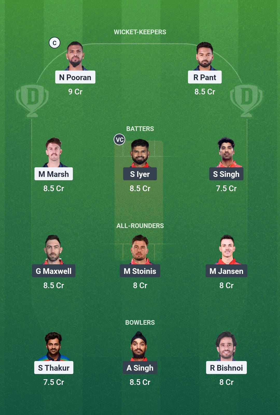 Lucknow Super Giants: Mitchell Marsh, Aiden Markram, Nicholas Pooran, Rishabh Pant (c & wk), Ayush Badoni, David Miller, Abdul Samad, Shardul Thakur, Ravi Bishnoi, Avesh Khan, Digvesh Rathi