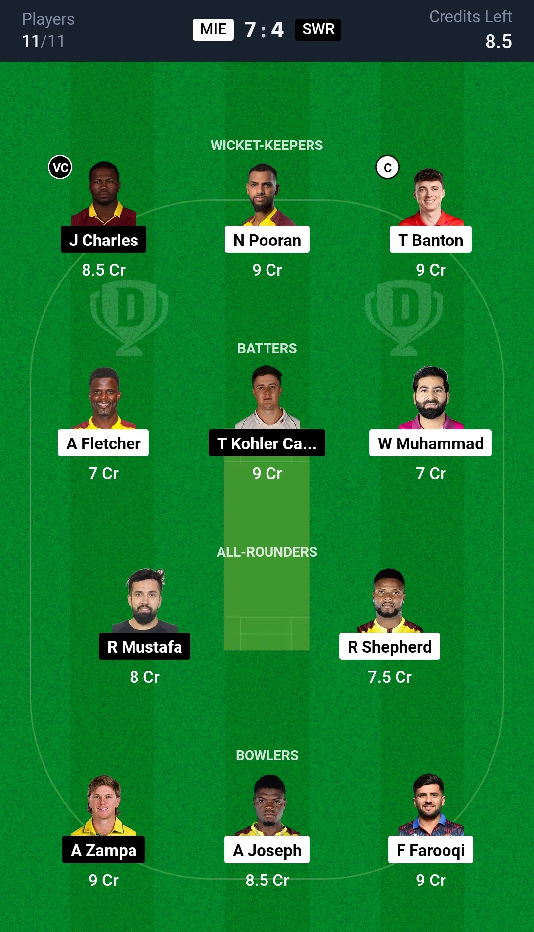 MI Emirates: Andre Fletcher, Muhammad Waseem, Kusal Perera, Tom Banton, Nicholas Pooran (c & wk), Bevon Jacobs, Dan Mousley, Romario Shepherd, Alzarri Joseph, Waqar Salamkhein, Fazalhaq Farooqi, Muhammad Rohid