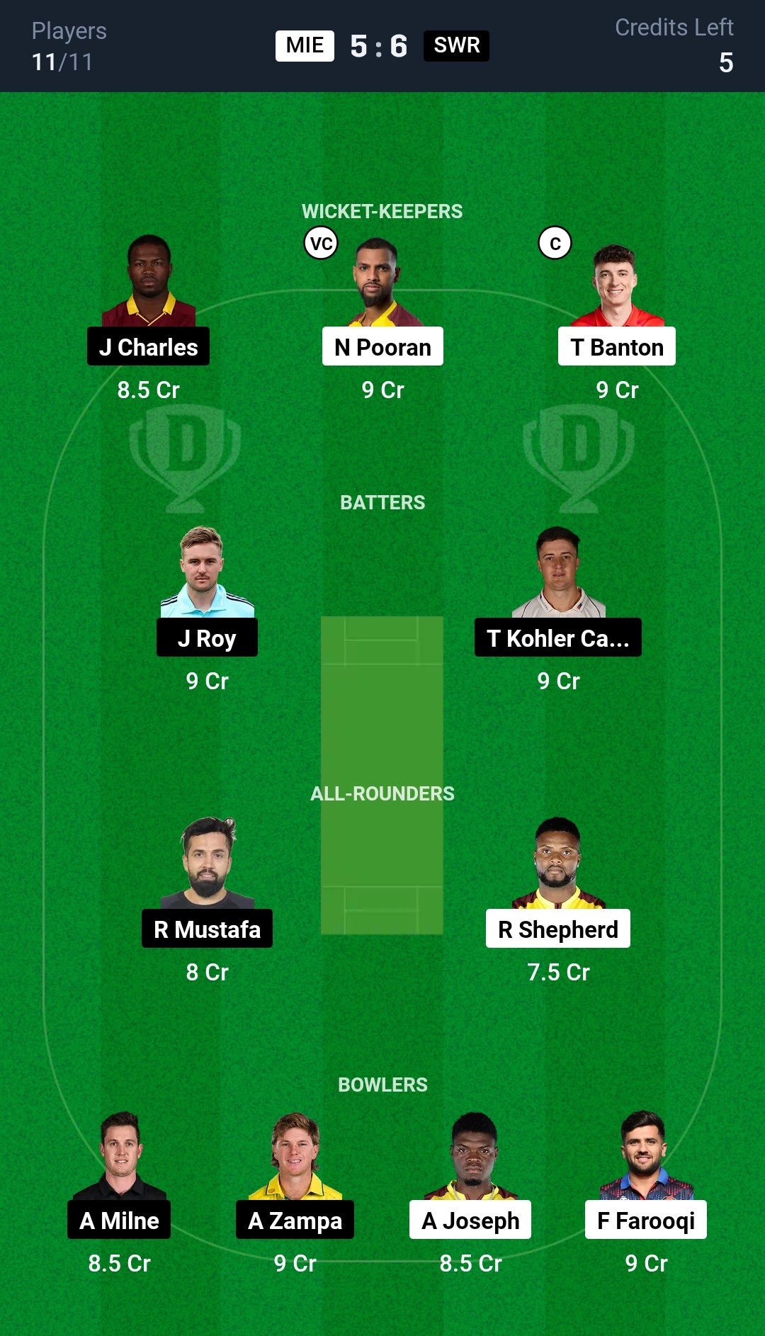 Sharjah Warriorz: Tom Kohler-Cadmore (wk), Johnson Charles, Rohan Mustafa, Jason Roy, Tim Seifert, Ashton Agar, Harmeet Singh, Ethan D’Souza, Adam Milne, Tim Southee (c), Dilshan Madushanka, Adam Zampa