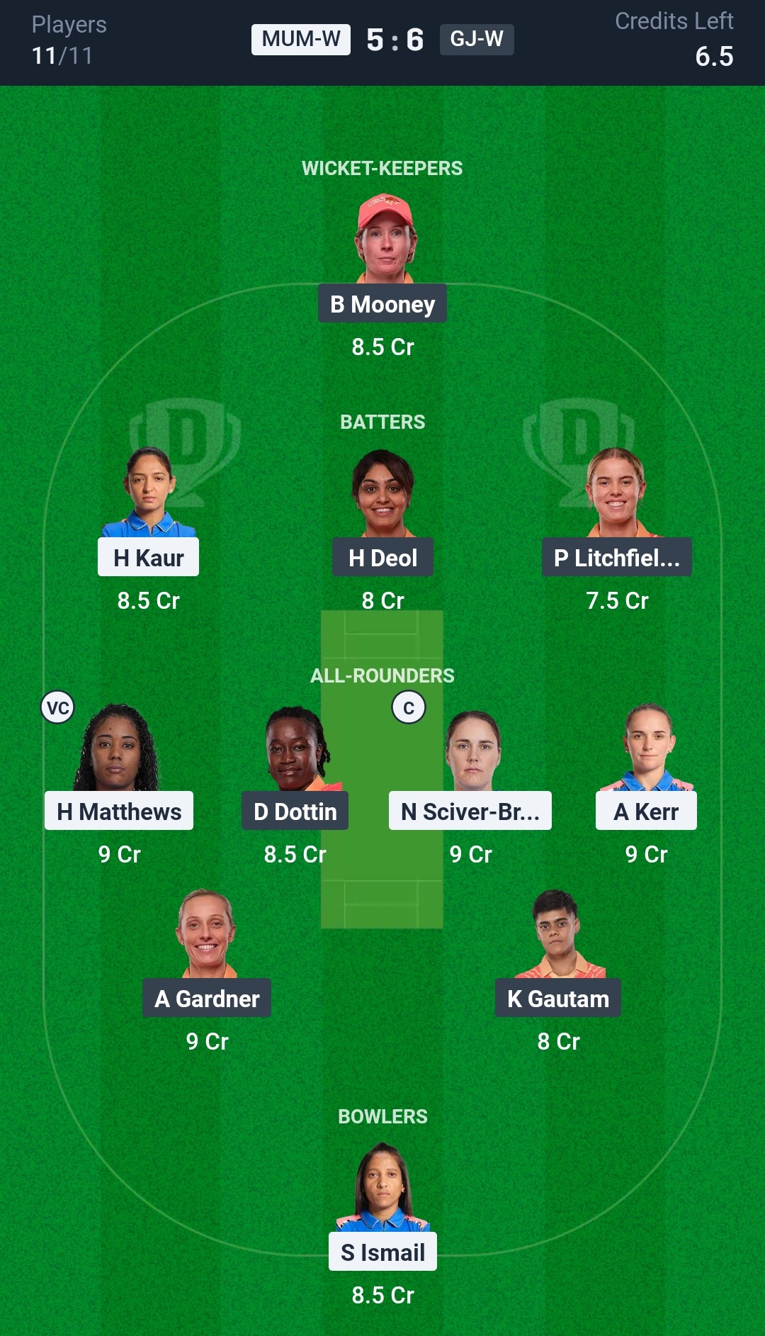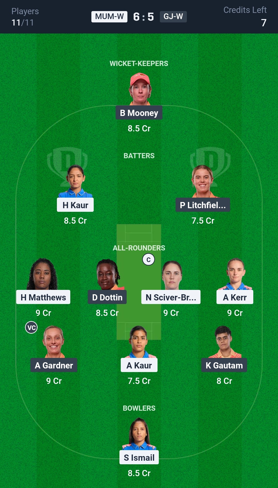 Mumbai Indians Women: Hayley Matthews, Amelia Kerr, Nat Sciver-Brunt, Harmanpreet Kaur (c), Sajeevan Sajana, Amanjot Kaur, Yastika Bhatia (wk), G Kamalini, Sanskriti Gupta, Shabnim Ismail, Parunika Sisodia