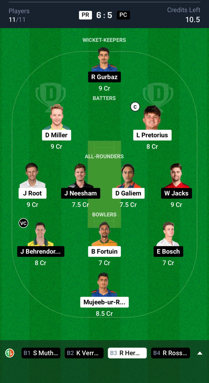 Paarl Royals: Lhuan-dre Pretorius, Joe Root, Rubin Hermann, Mitchell Van Buuren, David Miller (c), Dinesh Karthik (wk), Dayyaan Galiem, Keith Dudgeon, Bjorn Fortuin, Mujeeb Ur Rahman, Eshan Malinga