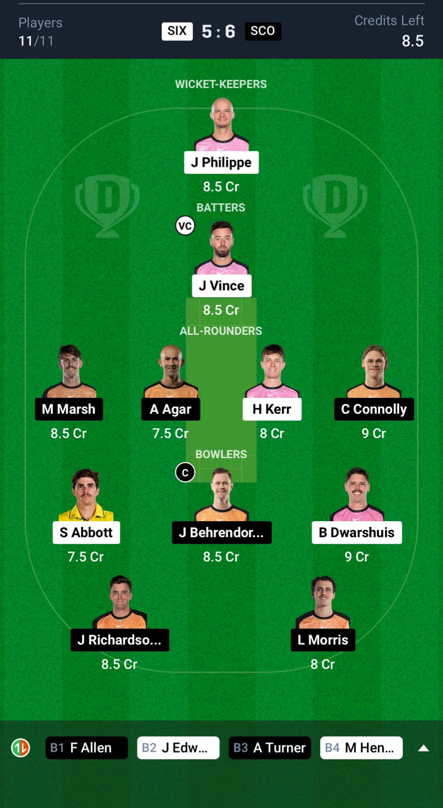 Sydney Sixers: Josh Philippe (wk), James Vince, Kurtis Patterson, Moises Henriques (c), Jordan Silk, Jack Edwards, Hayden Kerr, Ben Dwarshuis, Sean Abbott, Akeal Hosein, Todd Murphy