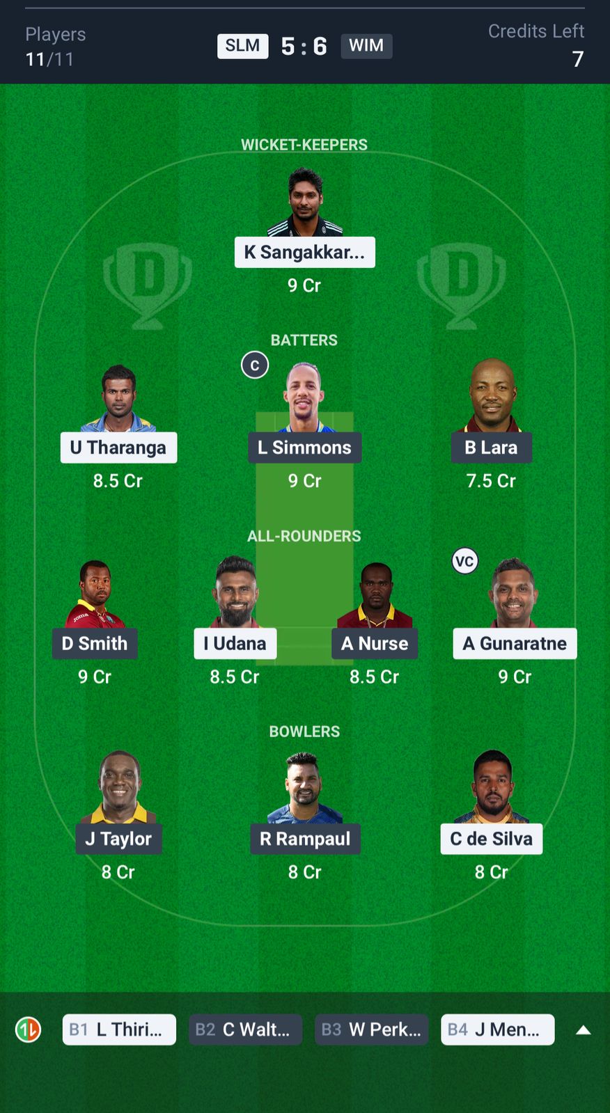 Small League Team for SLM vs WIM Dream11 Prediction
