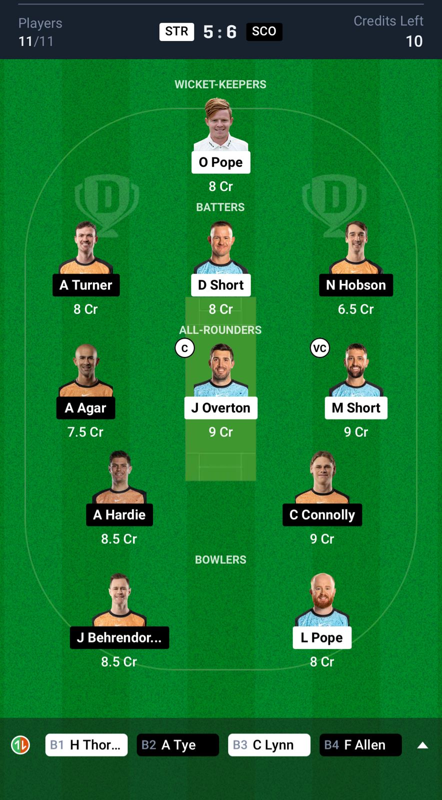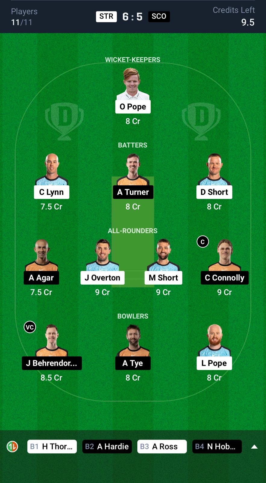 Perth Scorchers: Finn Allen, Matthew Hurst (wk), Cooper Connolly, Aaron Hardie, Ashton Turner (c), Nick Hobson, Ashton Agar, Matthew Kelly, Andrew Tye, Jason Behrendorff, Lance Morris