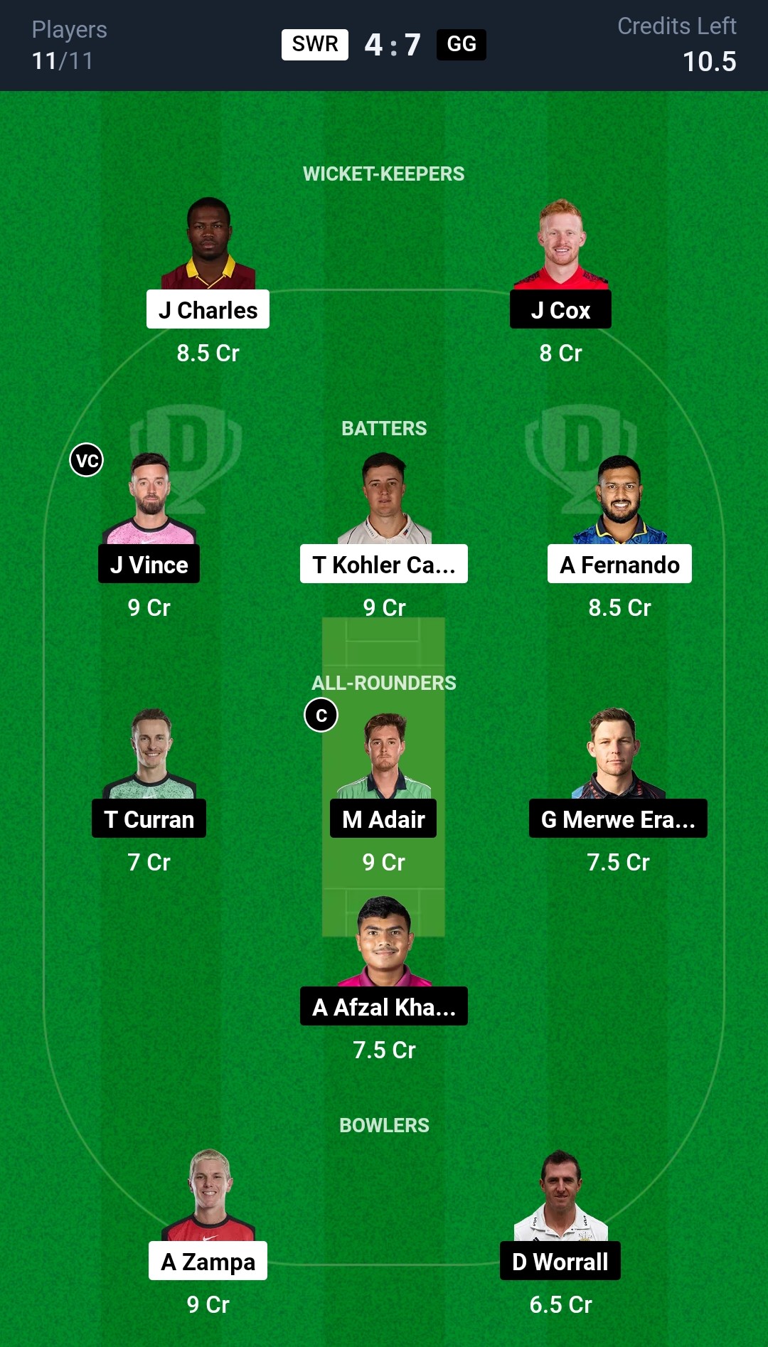 Gulf Giants: James Vince (c), Tom Alsop, Jordan Cox (wk), Gerhard Erasmus, Shimron Hetmyer, Ibrahim Zadran, Tom Curran, Mark Adair, Aayan Khan, Daniel Worrall, Muhammad Zuhaib, Blessing Muzarabani