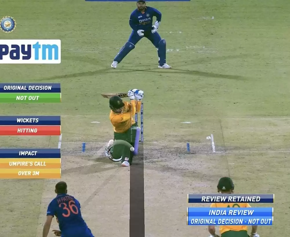 An incident with the 3-metre DRS rule being the main talking point came to light on Thursday (June 9) night in Delhi. South African batter Rassie van der Dussen was given not out after an LBW appeal by Indian pacer Harshal Patel in the first T20I even as the projected path showed the ball to be hitting the right-hander in line with the stumps.