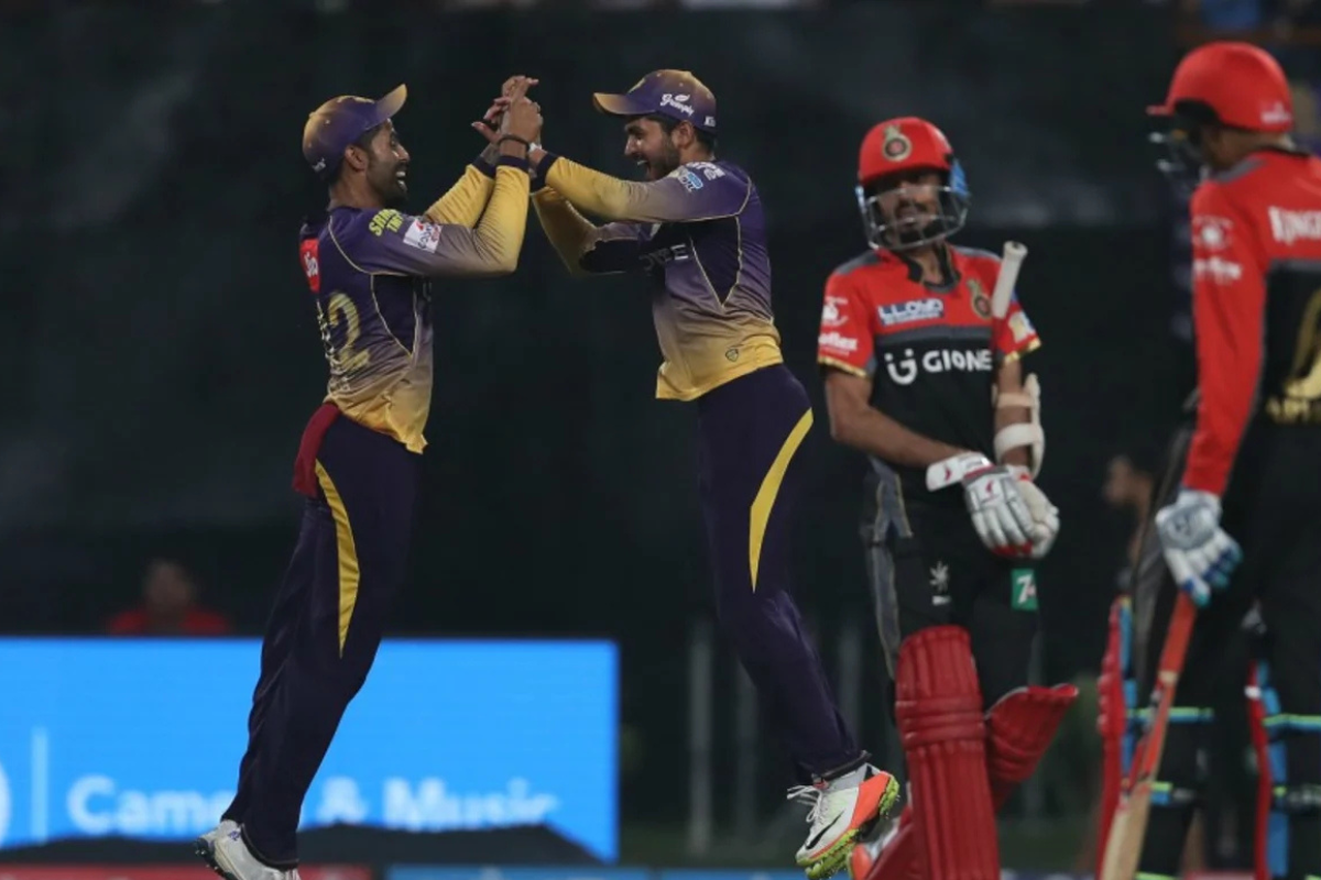 Nathan Coulter Nile, Chris Woakes, and Colin de Grandhomme took three wickets each, while Umesh Yadav claimed one wicket. No RCB batter in the innings reached double digits, with Kedar Jadhav being the highest scorer with nine runs. KKR won the match by 82 runs.