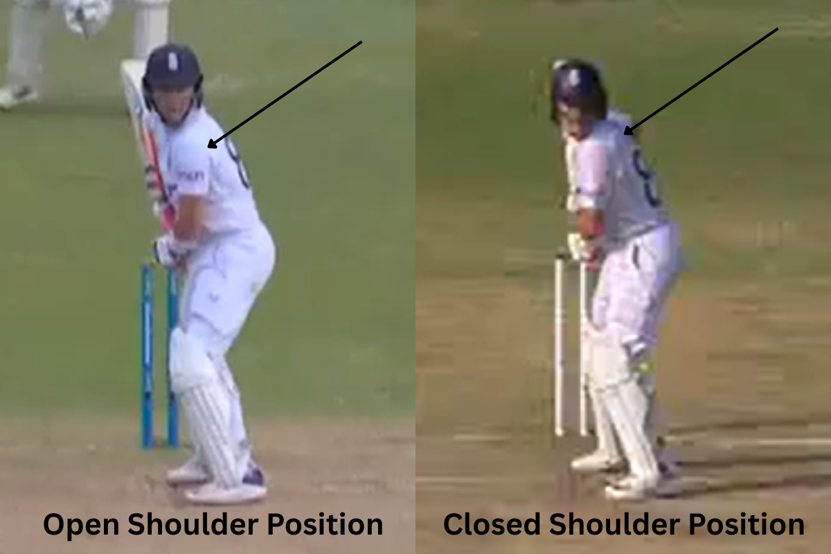 The picture on the left is from 2023. The one on the right is 2024. As we can see, Pope’s shoulder position was a lot more open in 2023, as compared to 2024. This makes life difficult to face the swinging ball. The left shoulder tends to open up a lot more quickly, resulting in an error in case the ball nips away. The idea for a batter to have a closed shoulder position is to not let the stance open up too early to the delivery. The way he lost his wicket to Akash Deep in the first innings of the second Test is a classic example of the same.