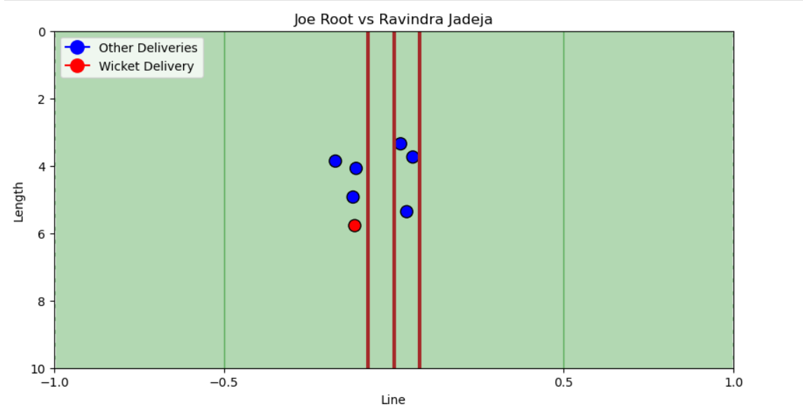 Joe Root’s interception points are always interesting. The average interception point of Root was 0.49 meters from the stumps against Jadeja before that wicket-taking delivery; on the dismissal one, he played 0.64 meters, which shows Root was stuck in between, for he could neither come on the front foot nor move off the backfoot fully.