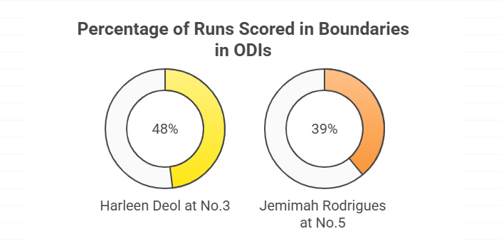 But here’s the catch. Harleen Deol has scored 58 fours and a six in her 13 innings batting at three. That’s 238 runs out of the 496 she’s scored. In simple words, Harleen Deol has scored almost 48% of her runs at No.3 in boundaries. On the other hand, Jemimah Rodrigues has managed 67 fours and three sixes in her 18 innings at five. In other words, the youngster has scored around 39% of runs in boundaries at No.5.