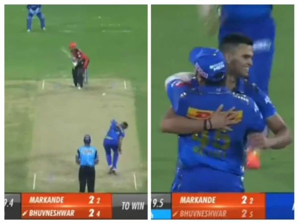 Arjun Tendulkar bowled a fuller-length delivery, almost a yorker – outside off-stump – to Bhuvneshwar. The batter tried to hit down the ground, but the ball didn’t come nicely. As a result, he holed it out straight to cover, where Rohit completed an easy catch.