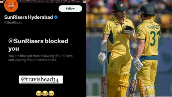 David Warner tagged Travis Head on a screenshot showing that Warner is blocked by the official handle of Sunrisers Hyderabad. He did it deliberately after they bought Travis Head, Warner’s Aussie partner. Warner wrote that he was trying to repost Head’s story, where he tagged the official handle of Sunrisers Hyderabad after being sold, but couldn’t due to being blocked.