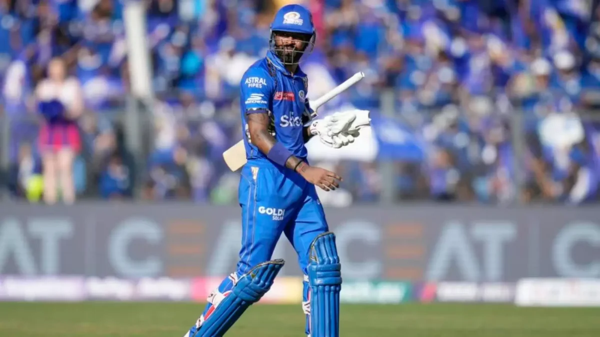 The replays showed Hardik had moved outside the off stump, so it was not a wide ball, and Mumbai Indians (MI) lost a review. On the next delivery, Avesh bowled a full toss, but Pandya missed his shot, and the ball hit his pads.