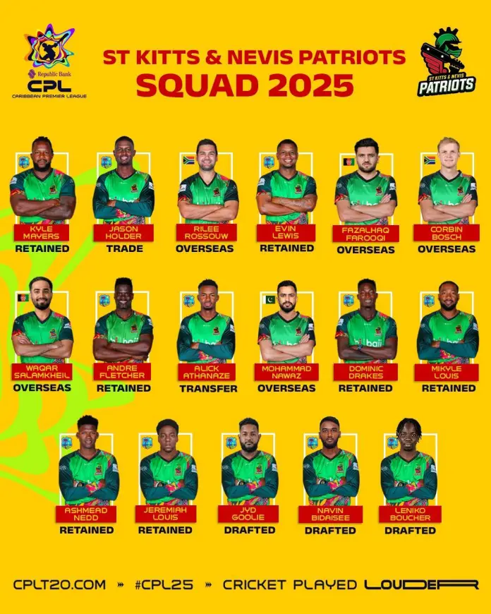St.Kitts and Nevis Patriots:  Kyle Mayers, Jason Holder, Rilee Rossouw, Evin Lewis, Fazalhaq Farooqi, Corbin Bosch, Waqar Salamkheil, Andre Fletcher, Alick Athanaze, Mohammad Nawaz, Dominic Drakes, Mikyle Louis, Ashmead Nedd, Jeremiah Louis, Jyd Goolie, Navin Bidaisee, Leniko Boucher