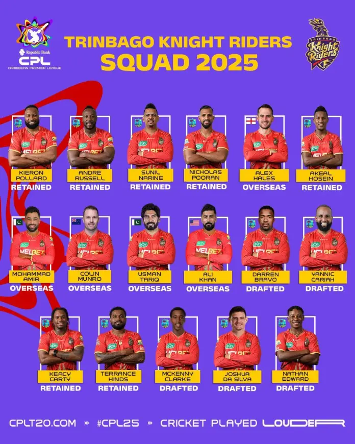 Trinbago Knight Riders:  Kieron Pollard, Andre Russell, Sunil Narine, Nicholas Pooran, Alex Hales, Akeal Hosein, Mohammad Amir, Colin Munro, Usman Tariq, Ali Khan, Darren Bravo, Yannic Cariah, Keacy Carty, Terrance Hinds, McKenny Clarke, Joshua Da Silva, Nathan Edward