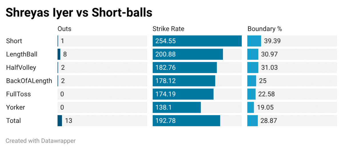 In the IPL as well, since the past season, Shreyas Iyer has actually dominated when faced with a short-ball. His strike rate and boundary percentage are the highest across all other types of deliveries.