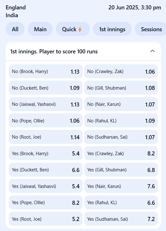 ENG vs IND 1st Test Player to Score a Century Odds