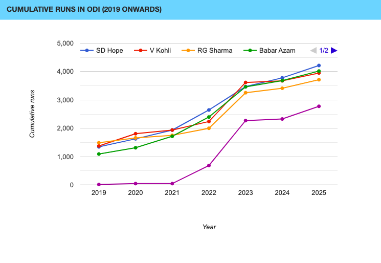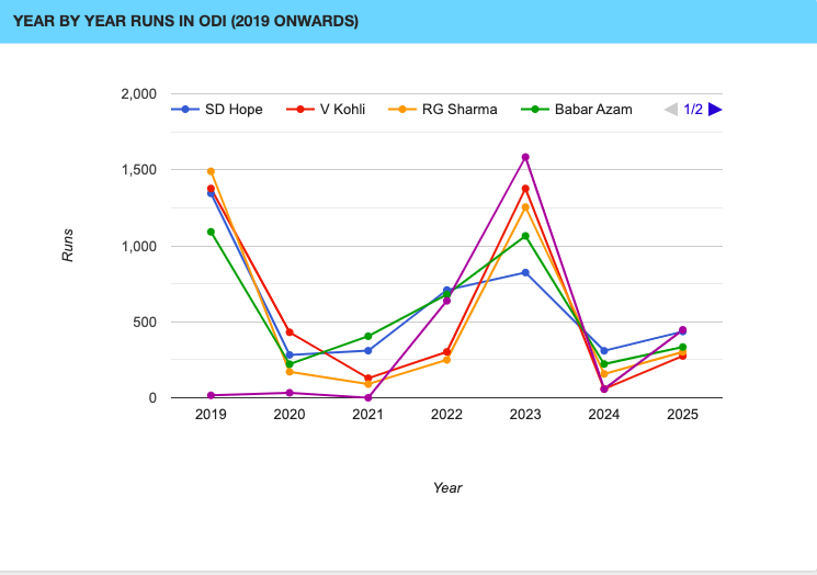 In the following diagram below, it can be noticed that across every year since 2019, Hope comes out on top of at least three other names, except for 2023, which serves as a testament to his sheer prowess and consistency. In 2024 and 2025, Hope has scored the highest runs per annum compared to the other four.