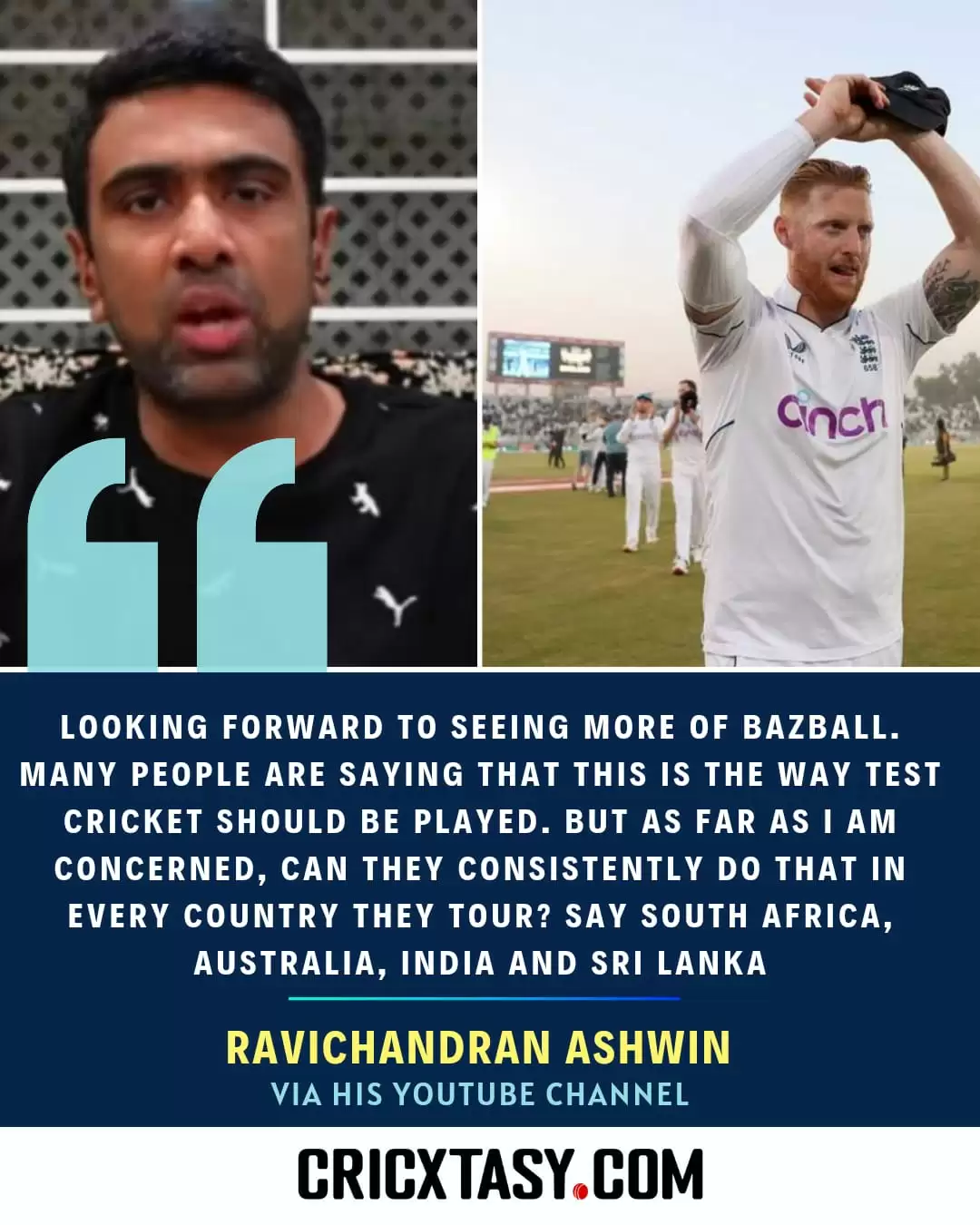 Ashwin praised the three lions for their incredible triumph in the first Test in Rawalpindi against Pakistan, wherein Stokes & company reigned supreme to score 657 and 264/7 declared at a tempo above 6 runs an over and then toppled off the hosts for 579 and 268 on a docile surface in an equally impressive bowling display.