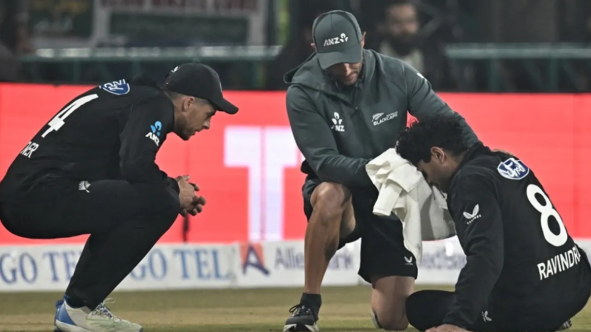In the 38th over of the second innings, Pakistan batter Khushdil Shah slog-swept a delivery of Michael Bracewell. Rachin Ravindra was seen running towards deep square leg to take the catch. Amidst the bright floodlights, the youngster lost sight of the ball and got hit in the face. His forehead started bleeding instantly and the medical team rushed in right away to attend him. After a few minutes of immediate treatment, Ravindra left the ground while covering his face with a towel.