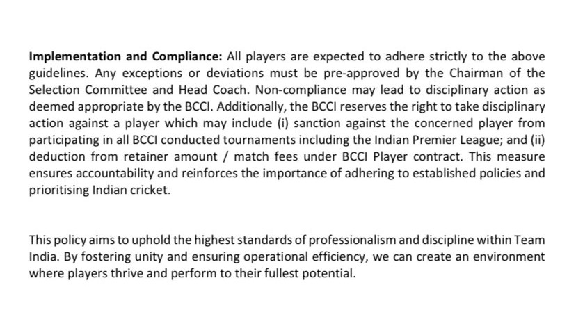 “All players are expected to adhere strictly to the above guidelines. Any exceptions or deviations must be pre-approved by the Chairman of the Selection Committee and Head Coach. Non-compliance may lead to disciplinary action as deemed appropriate by the BCCI”