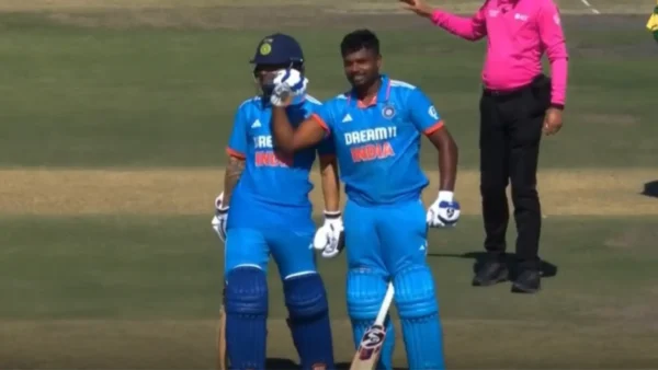 Sanju Samson completed his maiden international century in the 44th over and was happy beyond boundaries. Unlike his previous knocks, he had done the hard yards and made sure not to lose his wicket. However, his celebration after the milestone was something that caught much attention.