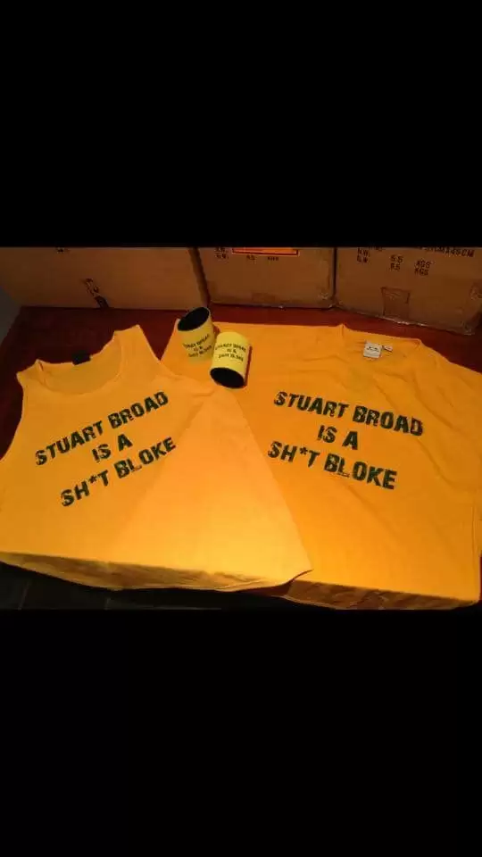 So, in 2013, the Australians (yeah, no surprise!) decided they had to taunt Stuart Broad in the home Ashes series. A group of Aussie guys printed out shirts, caps, cups, hats and other accessories in yellow with the line – ‘Stuart Broad is a sh*t bloke’.