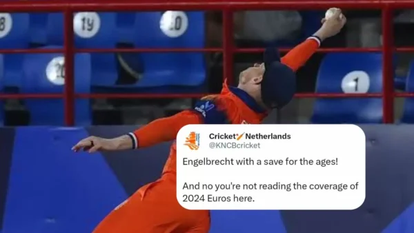 It seems that even though it was too little to keep the Netherlands’s hope alive in the T20 World Cup 2024, it might turn out to be one of the most bizarre moments in the tournament’s history. Though the Dutch team’s record shows it was simply another showing of remarkable stamina and talent in the field against Sri Lanka in the T20 World Cup 2024 clash, Netherlands star cricketer Sybrand Engelbrecht downplayed his superhero-style six-save on the midwicket boundary.