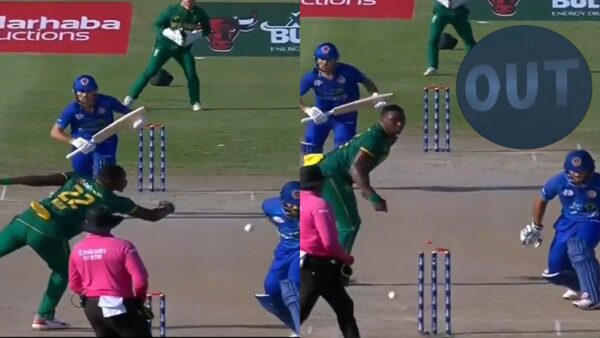 On the fifth ball of the ninth over of the game, Rahmanullah Gurbaz attempted to drive Ngidi’s ball straight down the ground. While it looked like a routine shot, what happened next was anything ordinary. Ngidi, to field the ball of his bowling, went out but failed to connect properly. The ball then deflected off his outstretched hands to his right, where Rahmat Shah, the non-striker player, had already taken a few steps out of his crease.