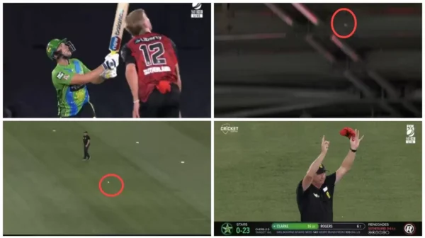 This happened when Stars batter Joe Clarke tried to hammer Renegades’ seamer Will Sutherland towards the on-side but got a leading edge that kept flying in the air. The ball kept rising up and went on to hit the artificial roof that covers the multi-purpose ground completely in Australia, famous for its baseball culture.