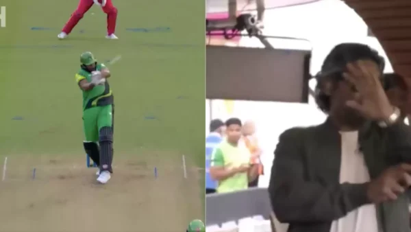 The commentary box, situated at ground level in that area was in the trajectory of the ball which prompted the commentators—including Sri Lankan legend Kumar Sangakkara and former England player Robert Croft to take quick evasive action, all of which was captured on camera.