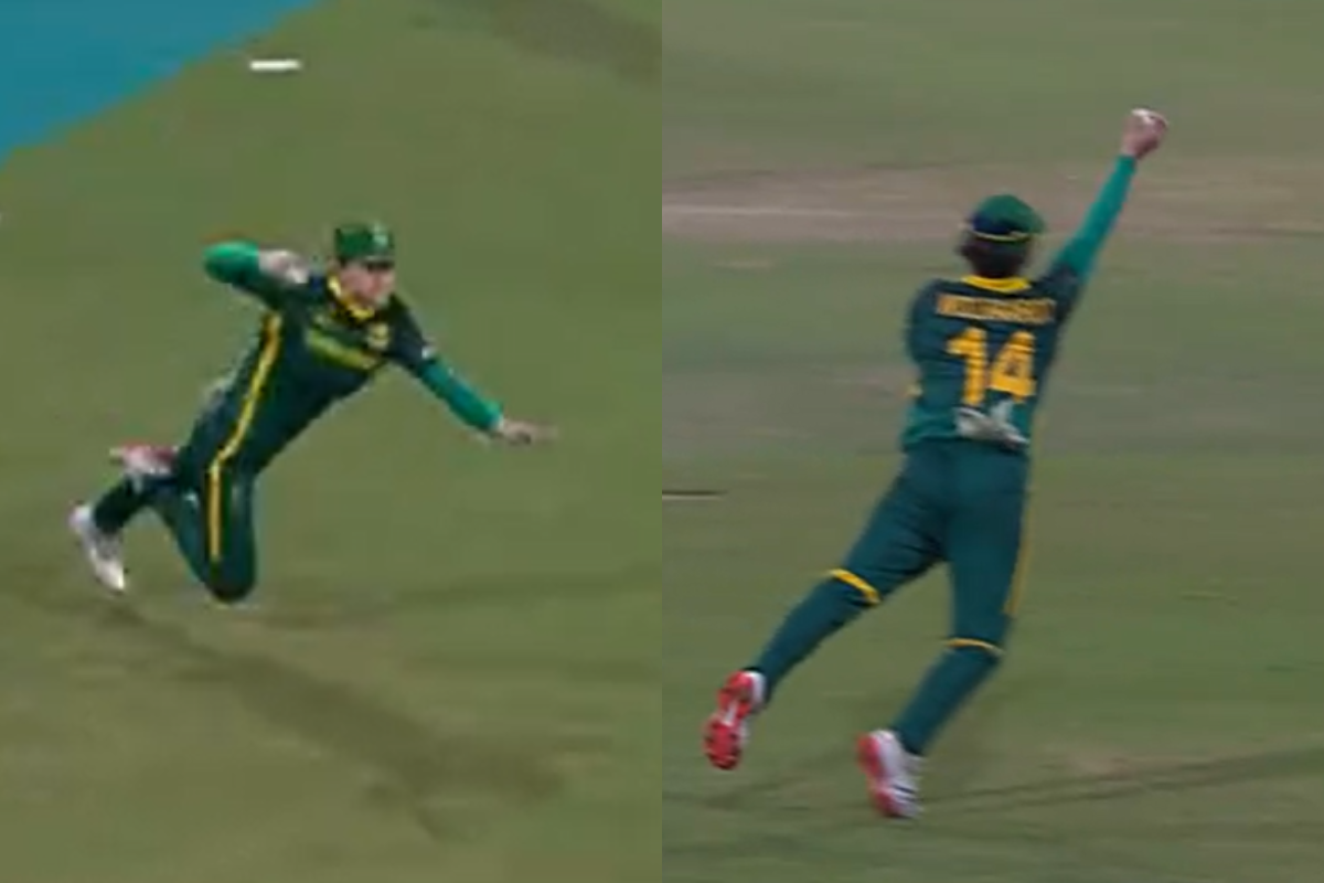 The catch was taken on the fifth delivery of the 47th over. Nonkululeko Mlaba bowled a half-volley, which was there to be hit. Out of all the places where Lea Tahuhu could have hit it, she ended up finding Laura Wolvaardt at covers. The South African skipper took two steps to her right and plunged into the air, completing a one-handed stunner.