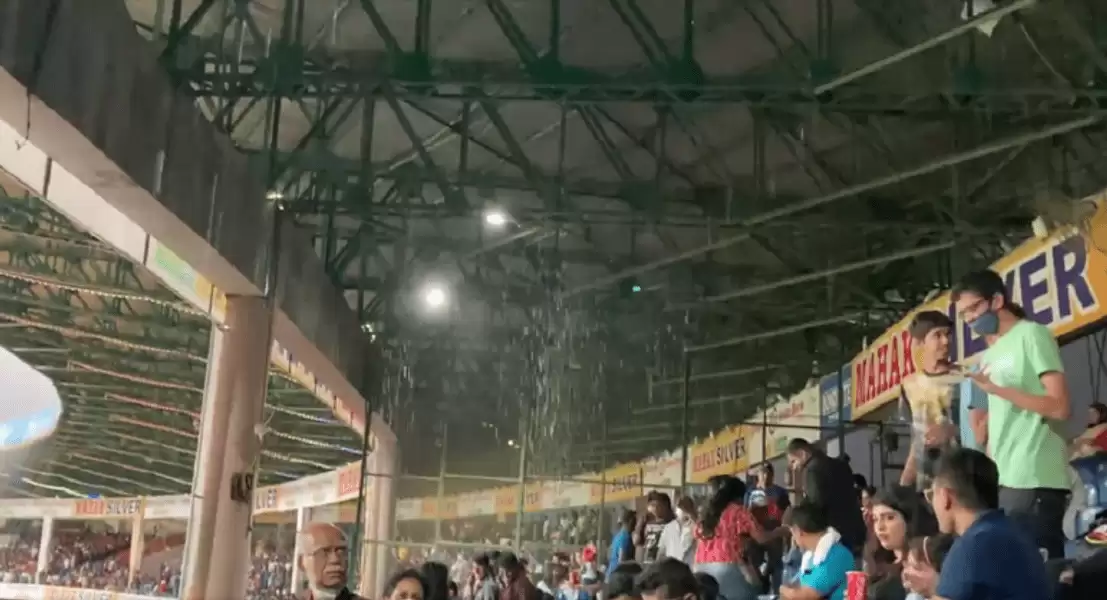A video surfaced over social media on the night of the rain abandoned fixture in the city where fans had to evade the water coming out of the space between the tins adjoining the roof of the stand in the sitting area.