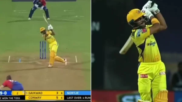 It was a fiery welcome into the attack for the South African as Gaikwad smashed him for a six. Nortje is known for his pace and he delivered a 144 kph ball first up only to see the batter step out to fuller length delivery andbang it over long-on. Gaikwad didn’t lose his balance despite coming down the track and hence, the connection was superb as the ball travelled the distance.