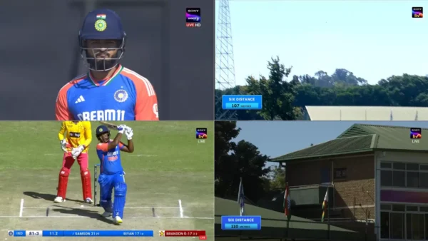 Mavuta bowled into Samson’s arc and he swung it beautifully as the ball went straight down the ground to hit the roof. The meter showed a massive 110m as Samson brought up his 300th six in T20Is.