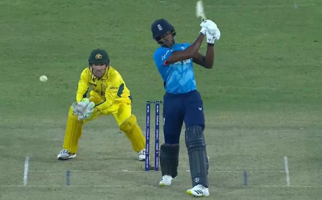 The incident in question occurred on the final delivery of the penultimate over of England’s innings. A flat aerial hit by Jofra Archer off Nathan Ellis’ full toss flew straight over the bowler’s head and landed just past the boundary cushion. The standing umpire did not feel the need to check with the third umpire and adjudged it as a four.